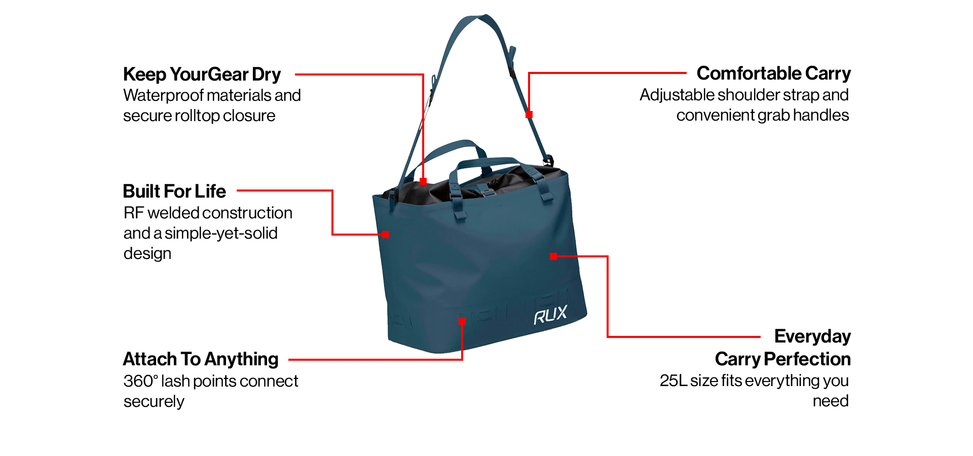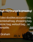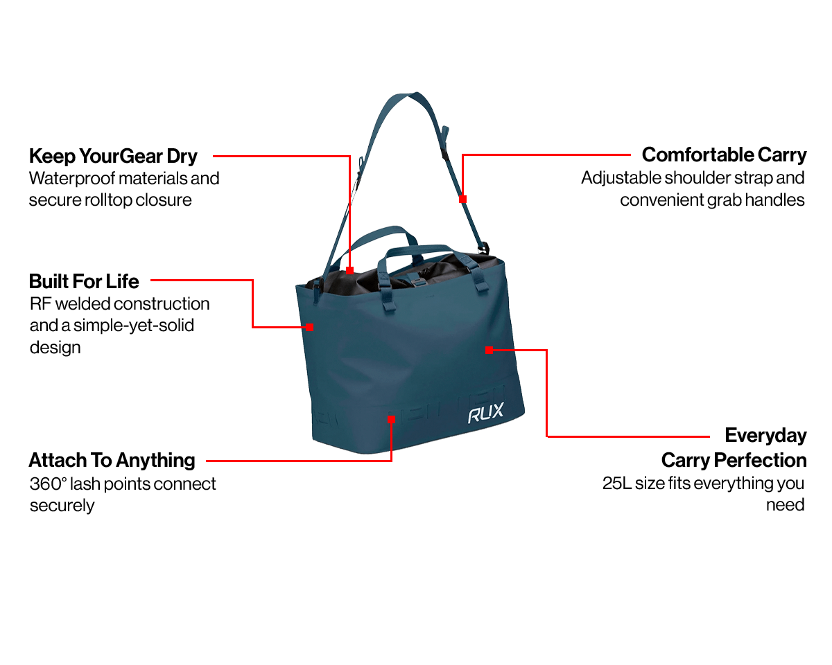 Si vous souhaitez ajouter une poche, prenez-en une RUX Pocket et se fixe facilement à l'extérieur de votre sac étanche. En cas de besoin, vous pouvez détacher votre Pocket pour l'utiliser avec d'autres produits RUX, notamment le RUX 70L ou le RUX Soft Cooler Bag, ou simplement emporter le Pocket seul.